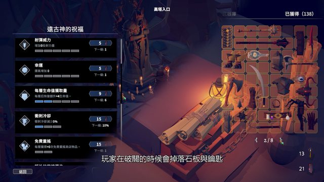 掉落石板與鑰匙,石板可以用來解鎖每場戰鬥的自帶優勢,像是攻擊力、開局更多金錢等
