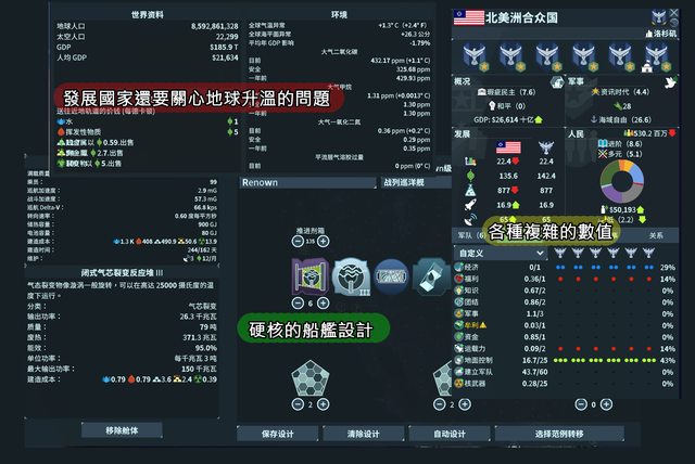 像是遊戲中國家發展GDP會導致社會不平等加劇,也會導致地球升溫,