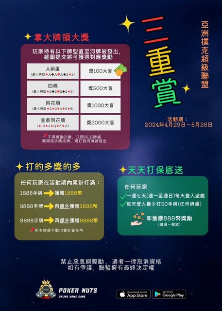每天登入遊戲最少打滿50手牌,就贈送888元獎勵。