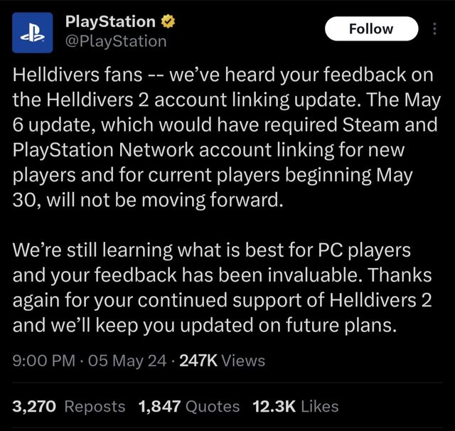 https://twitter.com/PlayStation/status/1787331667616829929?t=eEaYDHWEIhhN05Mcr P4V2g&s=19 你各位,民主的勝利! 原本打算5/30開始強制實施的PSN帳號連結政策,Sony在美國時間5/5晚上表示將不會施行 。 大概是被負評轟炸跟各種退款嚇到了吧,真的是不要挑戰玩家的極限,原本也打算要退款 了,看來可以再觀望一下。 -- ※ 發信站: 批踢踢實業坊(pttweb.org.tw), 來自: 70.137.105.247 (美國) ※ 文章網址: https://pttweb.org.tw/Steam/M.1714968893.A.896