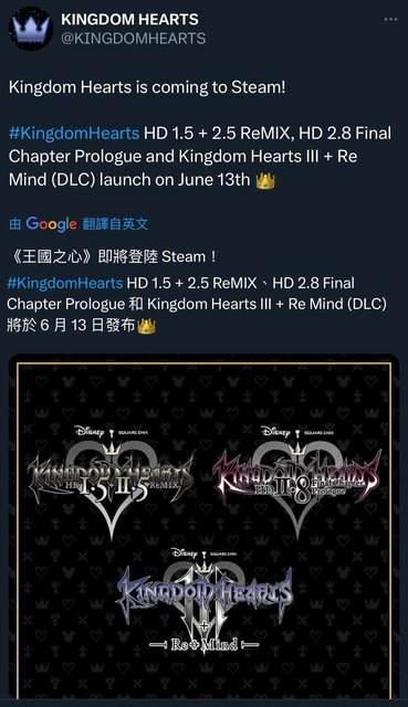 SE今天宣布王國之心大合輯將於6/13登陸Steam 預告片今晚23:00公開http://youtu.be/G5_3qdf19BU