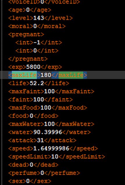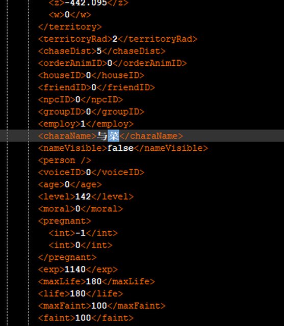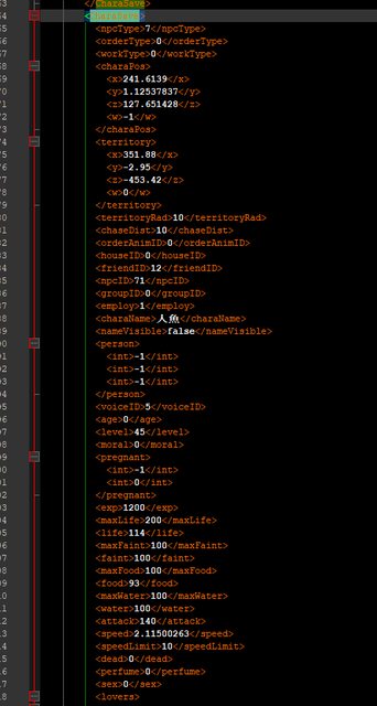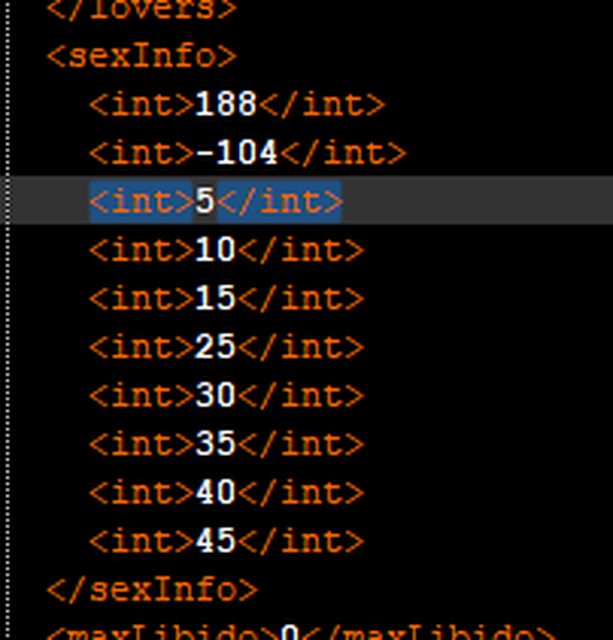 舉例而言這個sexInfo就是做愛次數,第一格位置應該是性行為次數(但現在不採用,他是統計上面那個<Lover>的總做愛次數來計算),第二格則是第一次對象(數值可以去看控制台召喚NPC的數字,前面打一個-),第三格是手淫,剩下是什麼都不知道,改完數值還要自己去核對XD