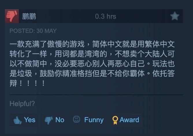 sk131: 這批評我倒覺得合理,當我看到繁中是簡中直翻一堆支語我也 05/31 05:23