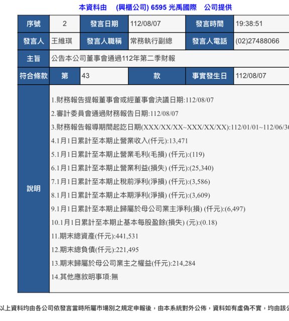 標題[情報] 6595 光禹國際 H1財報