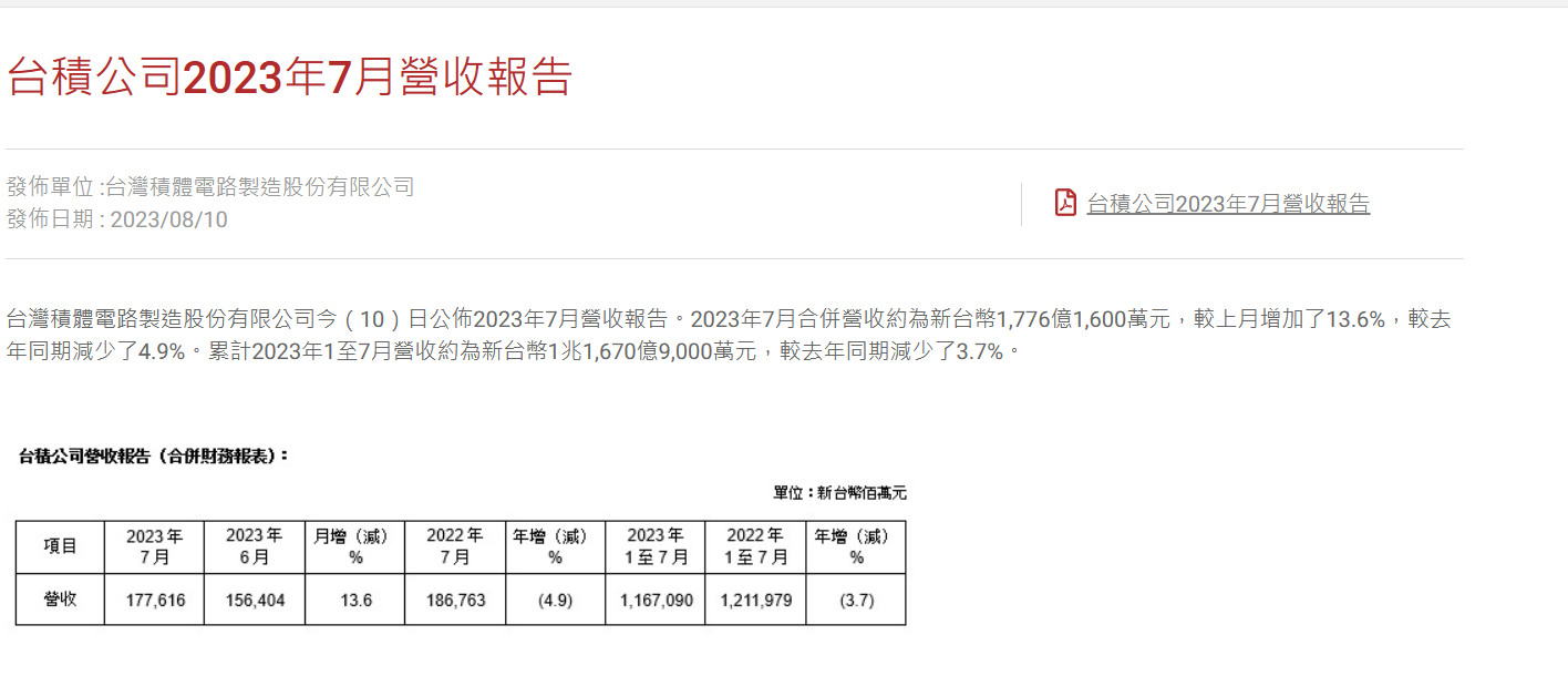 推 aweara : 台積電營收 沒啥好討論 鄭常都是年減月增 08/10 14:06