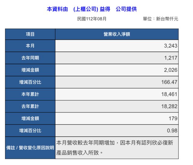 標題[情報] 6461 益得112年8月營收