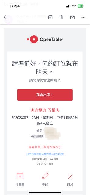 物品名稱:7/23 肉肉燒肉 五權店 11:30 4位