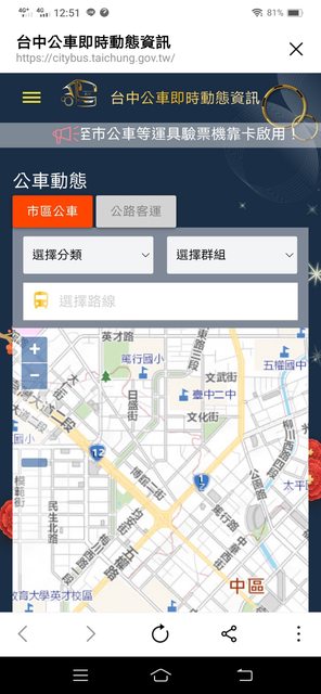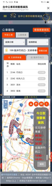 打個比方,如果有人問:哪牌的果汁最純、最健康? 我會回答:能夠的話,建議直接吃水果。 所以說,我會直接建議你用"台中市政府交通局"的網頁版, 我手邊有3款"台中市政府交通局"的網頁版, 想要詳細第一手訊息,最建議第一款,會直接顯示當日最新通阻訊息"今日取消發車資訊"。 ;想陽春型沒附地圖,建議第三款。 1.