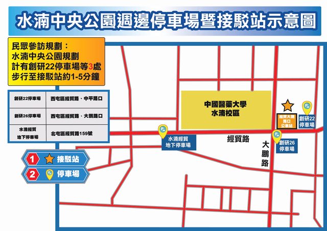 (3)水湳中央公園停車場:中央停車場、創研22、26停車場,計2,012個汽車停車位、922個