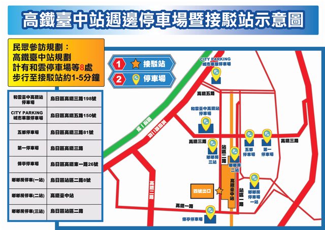 (1)高鐵臺中站-4號出口(烏日區站區二路8號)。