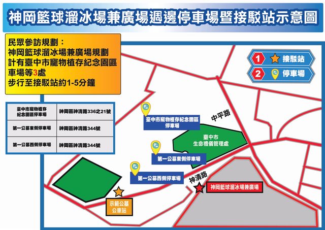 (5)神岡籃球溜冰兼廣場:計350個汽車停車位,步行至接駁站約1分鐘。