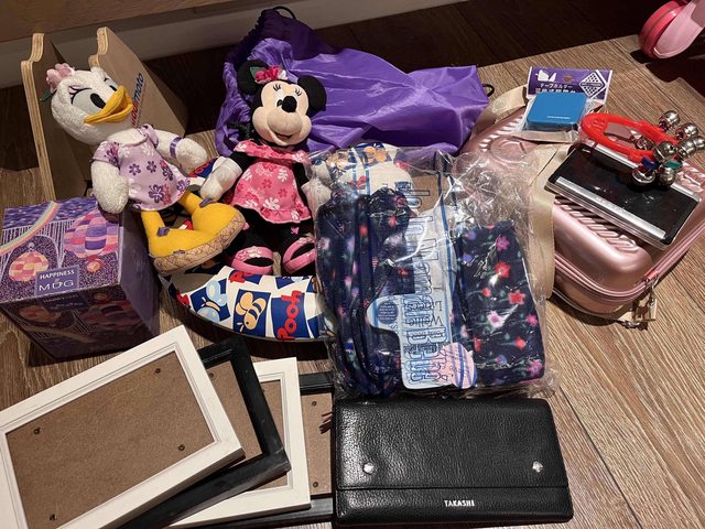東西有:米妮黛西玩偶(東京迪士尼買)、相框4個、有蓋馬克杯、兒童馬桶蓋、六成新真