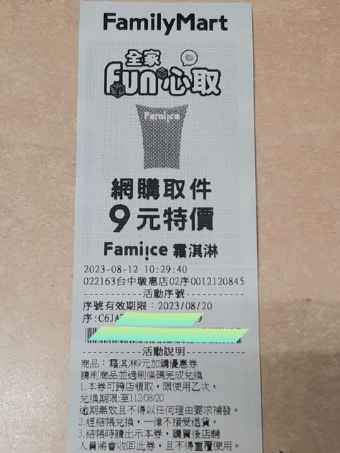 物品名稱:全家霜淇淋9元加購券
