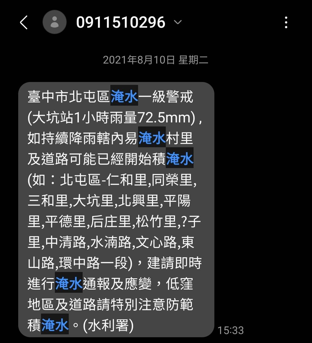 → edc59429 : 簡訊那是“災防告警通知“,不是大雨及豪雨特報 08/26 00:28