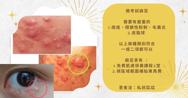 徵求內容詳述: 閉鎖性粉刺、毛囊炎、皮脂球技術考核模特兒