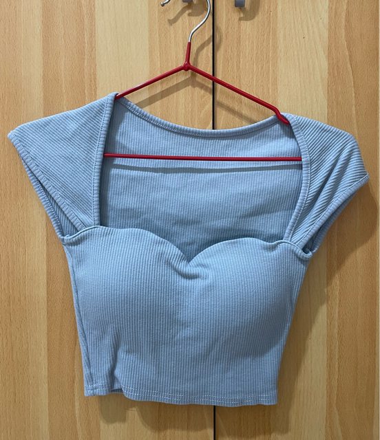 整理衣櫃,因為胖了,這些衣服幾乎只穿1-2次不然就是沒穿過,甚至還有全新的,上衣 一件都100,洋裝200,特殊品會再標價。 1.藍色桃心領短版上衣$100