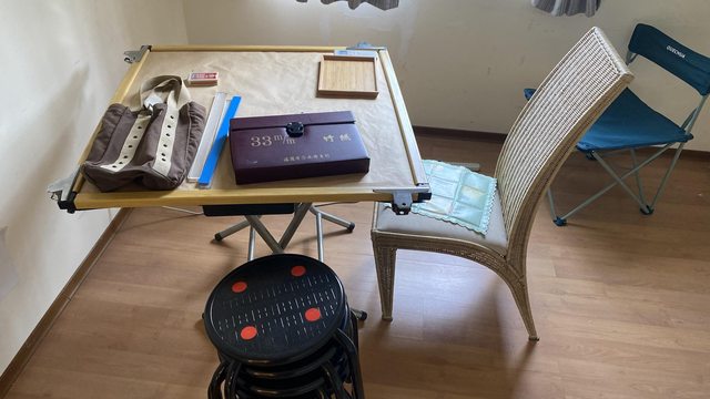 1.手動麻將桌+麻將+4張板凳+1張編織椅