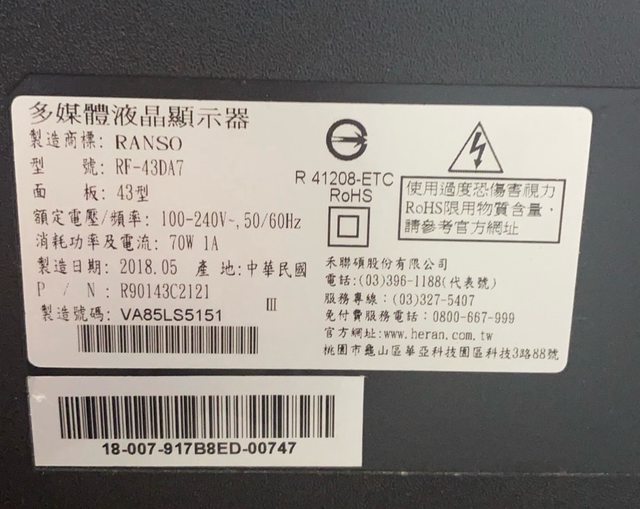 2. 聯碩43吋電視 RF-43DA7