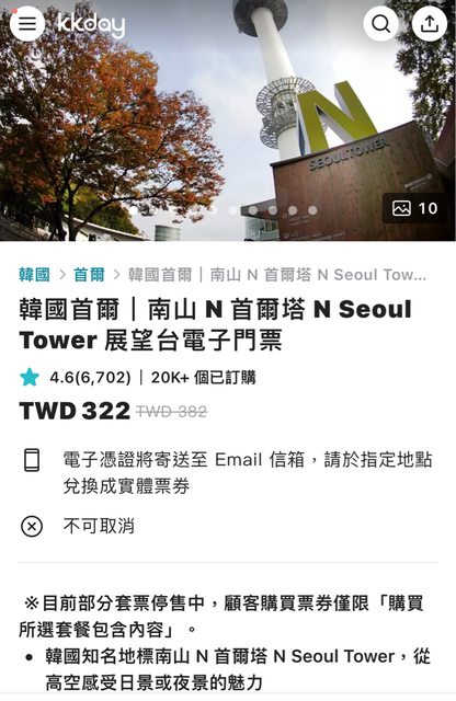 標題[交易] 台南 kkday 首爾塔展望台票券