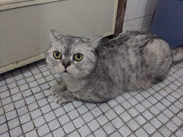 英短 有晶片,公的已結紮,白色底黑色紋路,頭大,不會咬人膽子比較小,體重約5公斤
