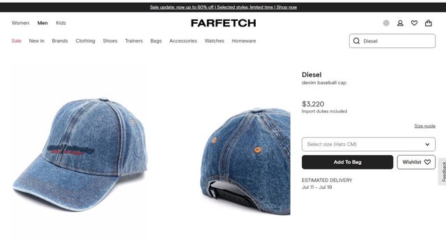 台南市區面交 Diesel 全新藍色牛仔棒球帽 現在Farfetch價錢是3320
