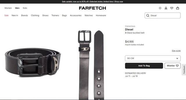 這個皮夾我去台南三井Outlet的Replay專櫃有看到 那邊是3980元然後打75折 全新Diesel 棕色皮帶 尺碼:90公分 適合31腰到34腰男生 這條現在在Farfetch有黑色的同款 4166元