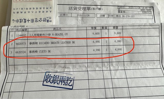 兩張事務椅,兩年多前購於宜得利(以下為當初訂購單)
