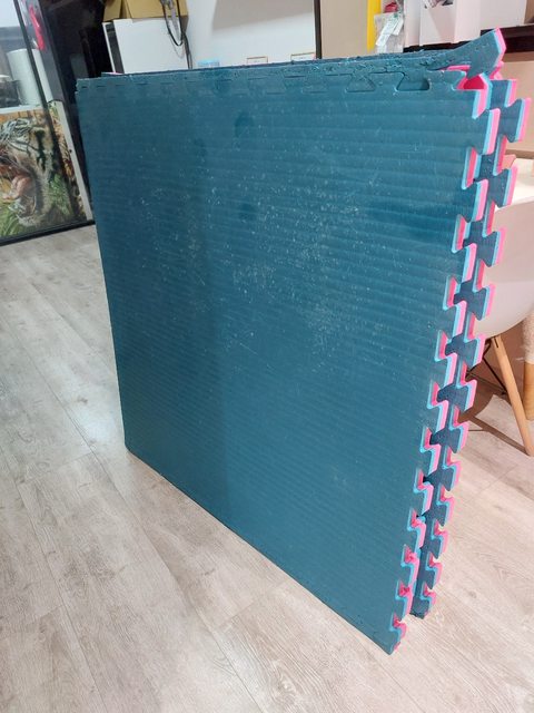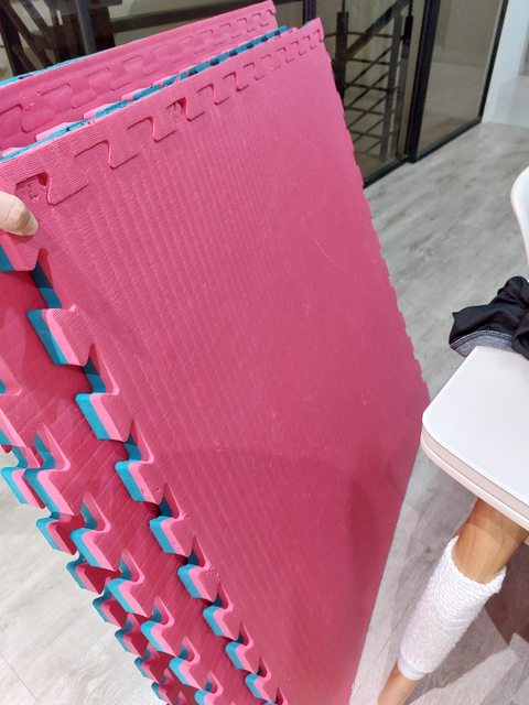 大塑膠地墊共四片。一片104公分方形厚度三公分。適合居家伸展或瑜伽使用。
