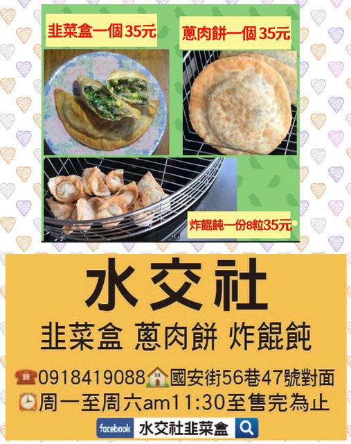 → cangeli: 回覆2樓,我們之前店名是吳董韭菜盒,搬來安南區後才改了水交社韭菜盒