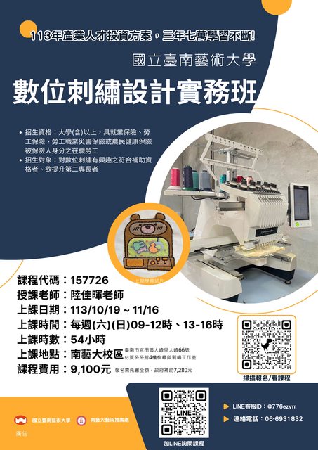 政府補助產業人才投資計畫課程「數位刺繡設計實務班」,只要報名至開課當天符合在職資