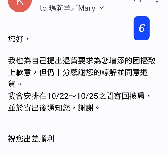 → kate64: 41樓的s大,我跟賣家從頭到尾都是透過mail連繫,在退貨之 10/30 07:24
