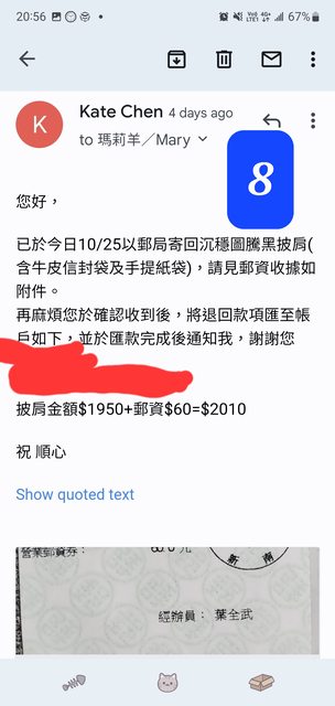 → nochewen: 幾月幾日幾點幾分已先收到賣家退款,退貨商品也已退至郵 10/30 17:09