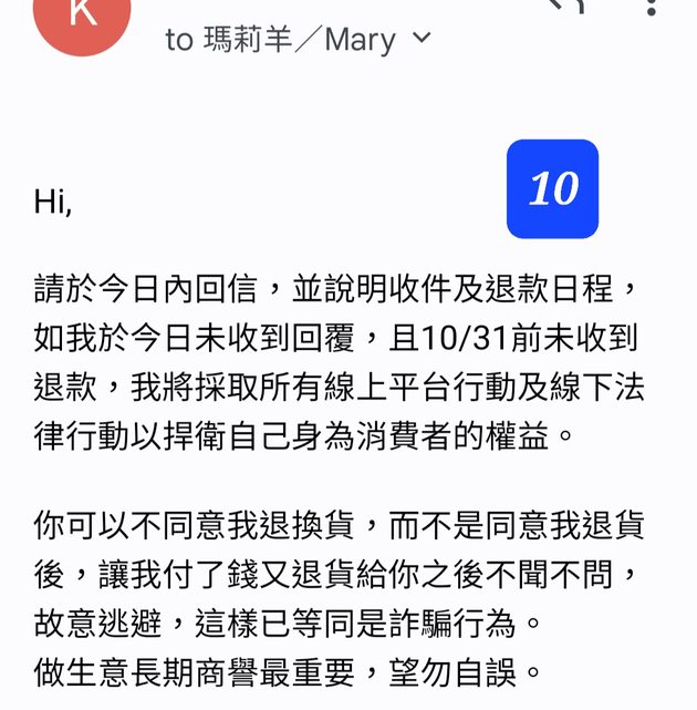 → kate64: 望對方在昨日內回信(如推文截圖),等到12點都沒等到回覆 10/30 07:14