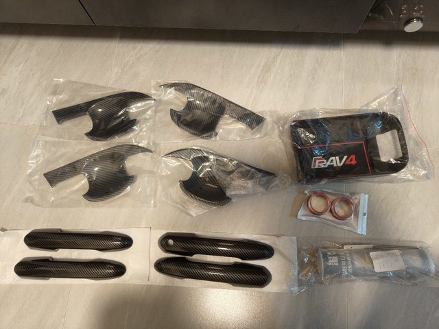 11.RAV4全新油電版配件1000元,有水轉印碳纖維把手/鋁合金旋紐/儀表犀牛皮包膜/中央