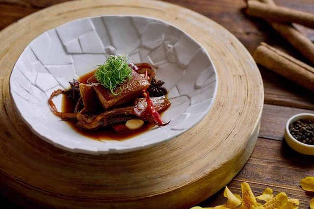 鬼頭刀和魷魚搭配豬五花,以慢燉手法再現航海時期保存食材的方。(台南晶英酒店提供