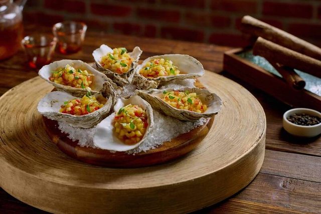 「薑味牡蠣佐鳳梨莎莎」,荷蘭時期,牡蠣殼常用於鋪路,也有紀錄荷蘭人出口「乾蠔」
