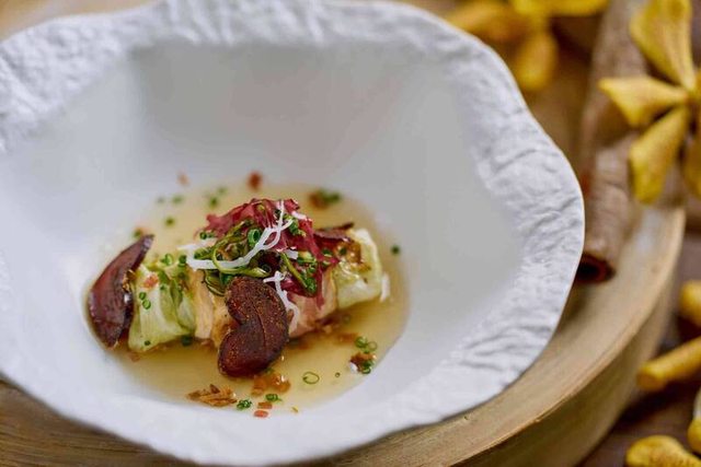 「蔬菜燉培根佐味自慢烏魚子」,荷蘭殖民時期烏魚是重要經濟魚種,而高麗菜則是荷蘭