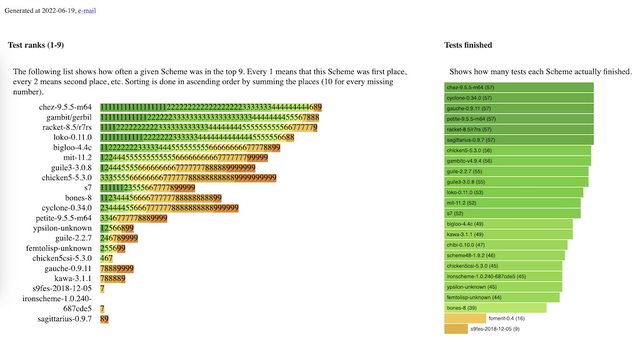根據截圖左半邊 Chez Scheme 有最多第一名 迷你基本版一般 但也有幾個第三名