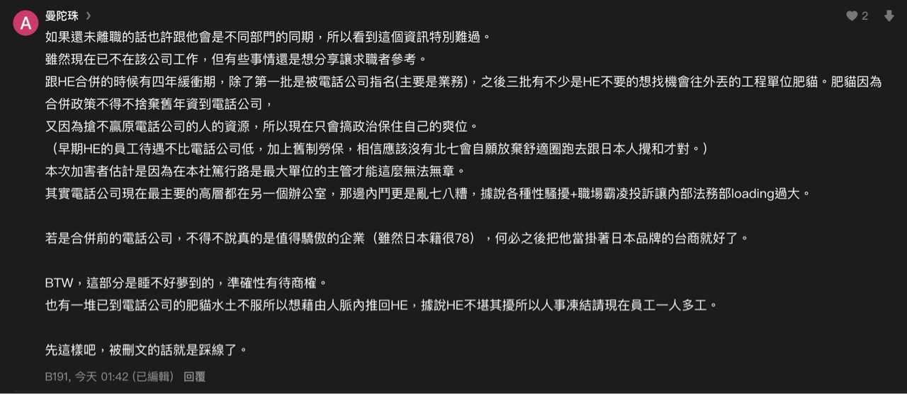推 tort : 不如講出主管是誰 若是真的就會有其他人出來爆料了 07/24 17:33