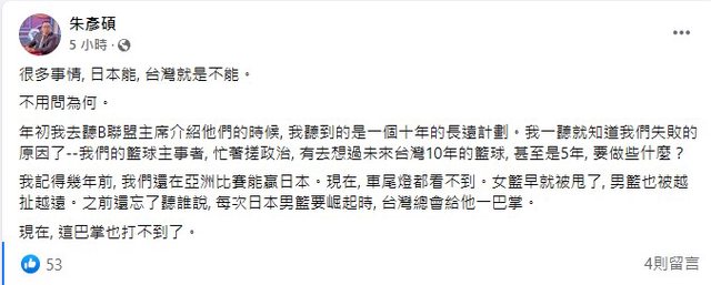 很多事情, 日本能, 台灣就是不能。 不用問為何。 年初我去聽B聯盟主席介紹他們的時候, 我聽到的是一個十年的長遠計劃。我一聽就知道 我們失敗的原因了--我們的籃球主事者, 忙著搓政治, 有去想過未來台灣10年的籃球, 甚 至是5年, 要做些什麼? 我記得幾年前, 我們還在亞洲比賽能贏日本。現在, 車尾燈都看不到。女籃早就被甩了, 男籃也被越扯越遠。之前還忘了聽誰說, 每次日本男籃要崛起時, 台灣總會給他一巴掌。 現在, 這巴掌也打不到了。 https://i.imgur.com/KJDTc33.jpg