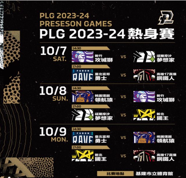 2023-24熱身賽10/07-10/09基隆開戰 P. LEAGUE+ 今日(09/08)公佈2023-24熱身賽賽賽程,將偕同高雄17直播鋼鐵人共同主 辦,於10/07 - 10/09在基隆開打。 聯盟及高雄17直播鋼鐵人攜手舉辦熱身賽,期待把南臺灣的籃球熱情帶到「雨都」基隆, 讓PLG新球季的熱潮能再次襲捲全台、共創全台籃球熱。屆時6隊都將進行2場熱身賽,各 隊季外補強的戰力整合、休賽季期間努力練兵的成果,都將透過這次熱身賽進行驗收,相 信比賽絕對精采可期。 PLG 2023-23熱身賽賽程如下,詳細售票資訊將由高雄17直播鋼鐵人負責。 https://i.imgur.com/9KC0OjF.png
