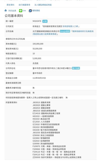 統一編號 94163478 公司狀況 核准設立 公司名稱 光芒運動娛樂發展股份有限公司 資本總額(元) 100,000,000 實收資本額(元) 50,000,000 每股金額(元) 10 已發行股份總數(股) 5,000,000 代表人姓名 呂丞凱 公司所在地 臺中市西屯區潮洋里市政北二路236號14樓之1 登記機關 臺中市政府 核准設立日期 112年08月15日 最後核准變更日期 複數表決權特別股 無 對於特定事項具否決權特別股 無 特別股股東被選為董事、監察人之禁止或限制或當選一定名額之權利 無 所營事業資料 J803010 運動表演業 J803020 運動比賽業 J802010 運動訓練業 JB01010 會議及展覽服務業 EZ14010 運動場地用設備工程業 I401010 一般廣告服務業 I501010 產品設計業 IZ12010 人力派遣業 IZ15010 市場研究及民意調查業 I301010 資訊軟體服務業 I301030 電子資訊供應服務業 J801030 競技及休閒運動場館業 IZ99990 其他工商服務業 I103060 管理顧問業 I102010 投資顧問業 I199990 其他顧問服務業 F109070 文教、樂器、育樂用品批發業 F209060 文教、樂器、育樂用品零售業 F104110 布疋、衣著、鞋、帽、傘、服飾品批發業 F204110 布疋、衣著、鞋、帽、傘、服飾品零售業 ZZ99999 除許可業務外,得經營法令非禁止或限制之業務 http://i.imgur.com/Wd0IjIE.jpg