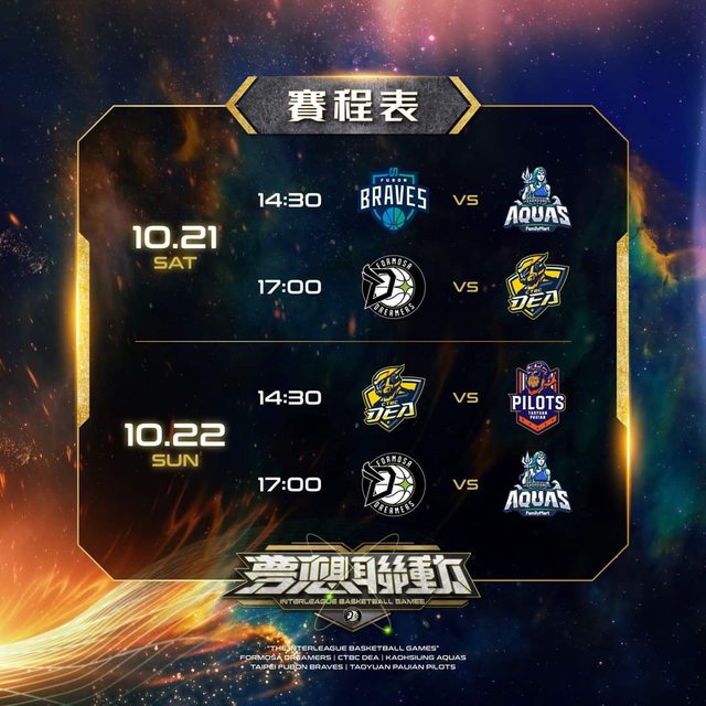 Dreamers News|   夢想聯動交流賽   |賽程對戰|   10/21 (六) 14:30 臺北富邦勇士 vs 高雄全家海神 17:00 福爾摩沙夢想家 vs 新北中信特攻   10/22 (日) 14:30 新北中信特攻 vs 桃園璞園領航猿 17:00 福爾摩沙夢想家 vs 高雄全家海神   正式開季前,感謝五支球隊空出時間共襄盛舉「夢想聯動交流賽」,千千萬萬的球迷們這次 千萬別錯過囉     日期:2023年10月21、22日 地點:臺中洲際迷你蛋 門票資訊:敬請期待   #夢想聯動 #GoDreamers https://i.imgur.com/obshV3o.jpg
