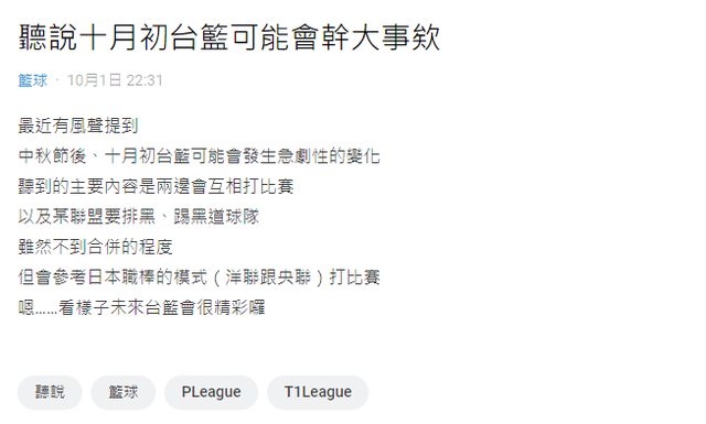 內容僅供參考 聽說新賽季可能兩個職籃聯盟球隊會打跨聯盟例行賽,會參考日職模式 然後各聯盟會排黑跟踢黑 https://i.imgur.com/yOplDbP.png