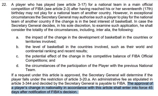 球員國籍變更的批准將在FIBA通知後45天生效