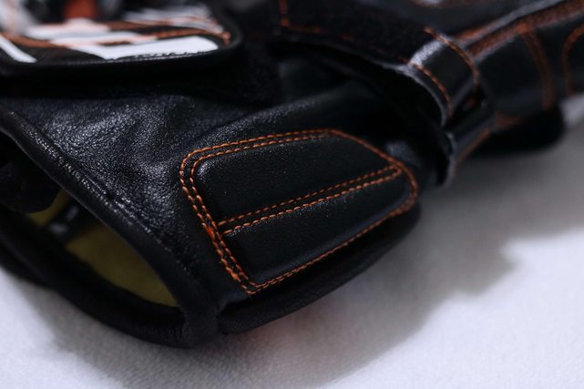翻到手掌面,黑色皮革搭上橘色縫線相當好看 手掌的皮革相當薄且柔軟 就像鼎泰豐的小籠包皮一樣(? https://i.imgur.com/WmKQlXf.jpg