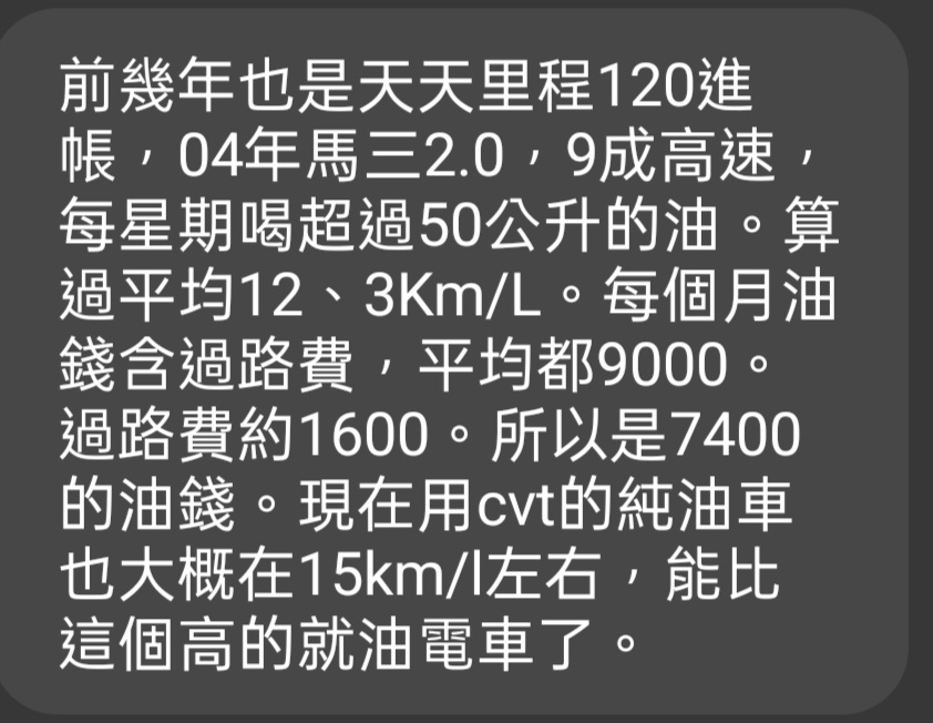 推 Porsche997: 跟我一樣通勤每天120公里,我自己就是開汽油cc,如果 04/08 11:39