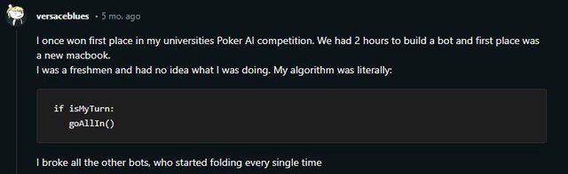 某大學舉辦AI撲克比賽 參賽者要用2小時寫一隻AI程式 再用該AI程式來打撲克比賽 一個只會AI基礎的大一新生也參加比賽 他的AI邏輯很簡單 「輪到我的回合,就歐印!」 if isMyTurn: goAllIn() 結果其他AI遇到它就縮了 莫名其妙就拿下冠軍 -- ※ 發信站: 批踢踢實業坊(pttweb.org.tw), 來自: 1.161.115.243 (臺灣) ※ 文章網址: https://pttweb.org.tw/joke/M.1697730972.A.F66
