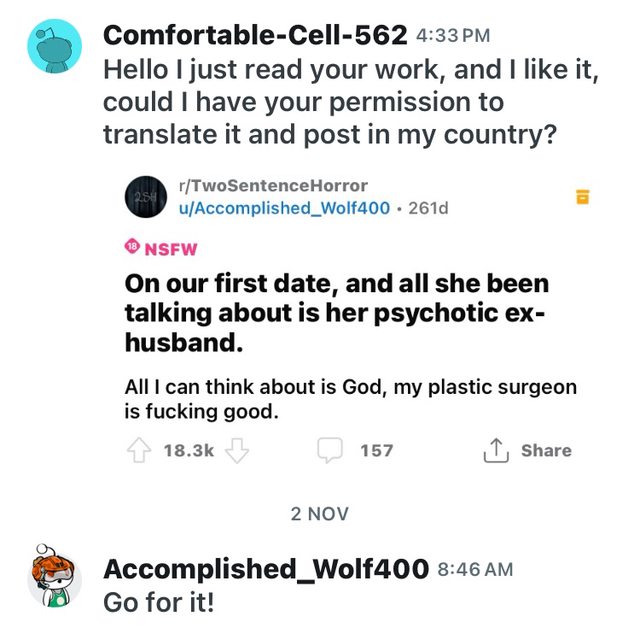 → greensdream: 然後神經病前夫找那個前妻約會,聽前妻講他的壞話, 05/25 04:47