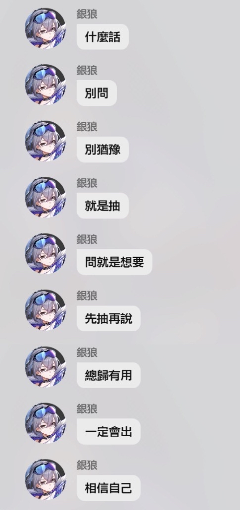 推 swind86516: 強度黨:抽卡芙卡 銀狼真愛:捏一下抽銀狼1+1 06/27 14:47